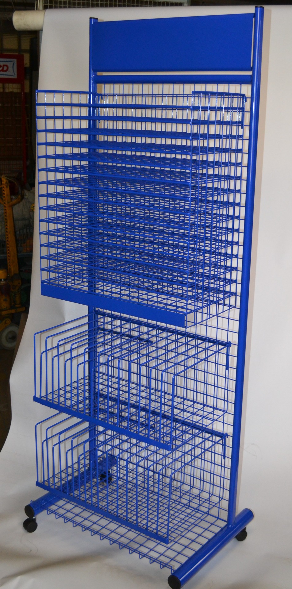 Velký a silný stojan - cca 220 x 120 cm, deska na reklamu lamino, sítě na zboží silnější, háčky atyp pro každý druh výrobku.
