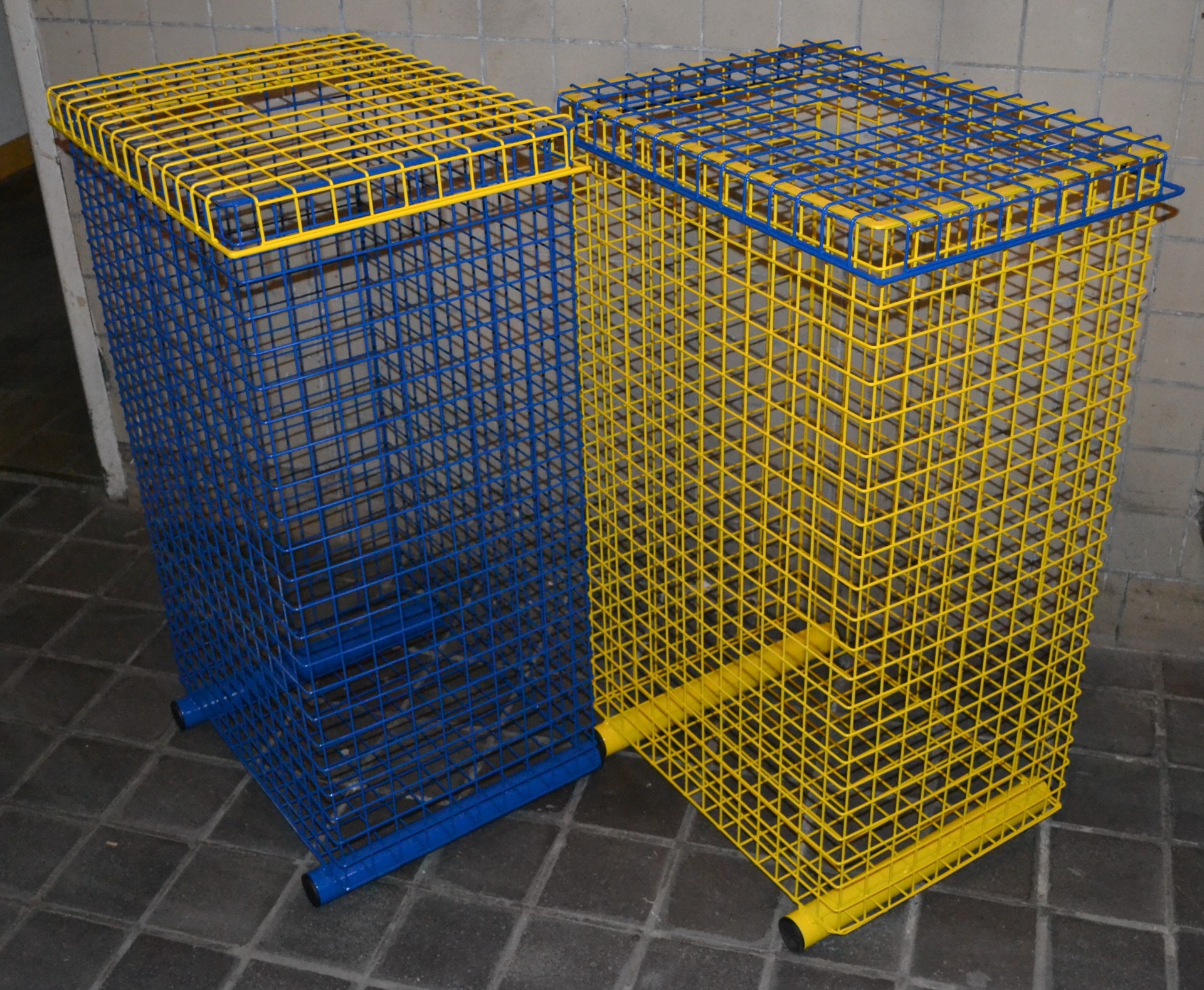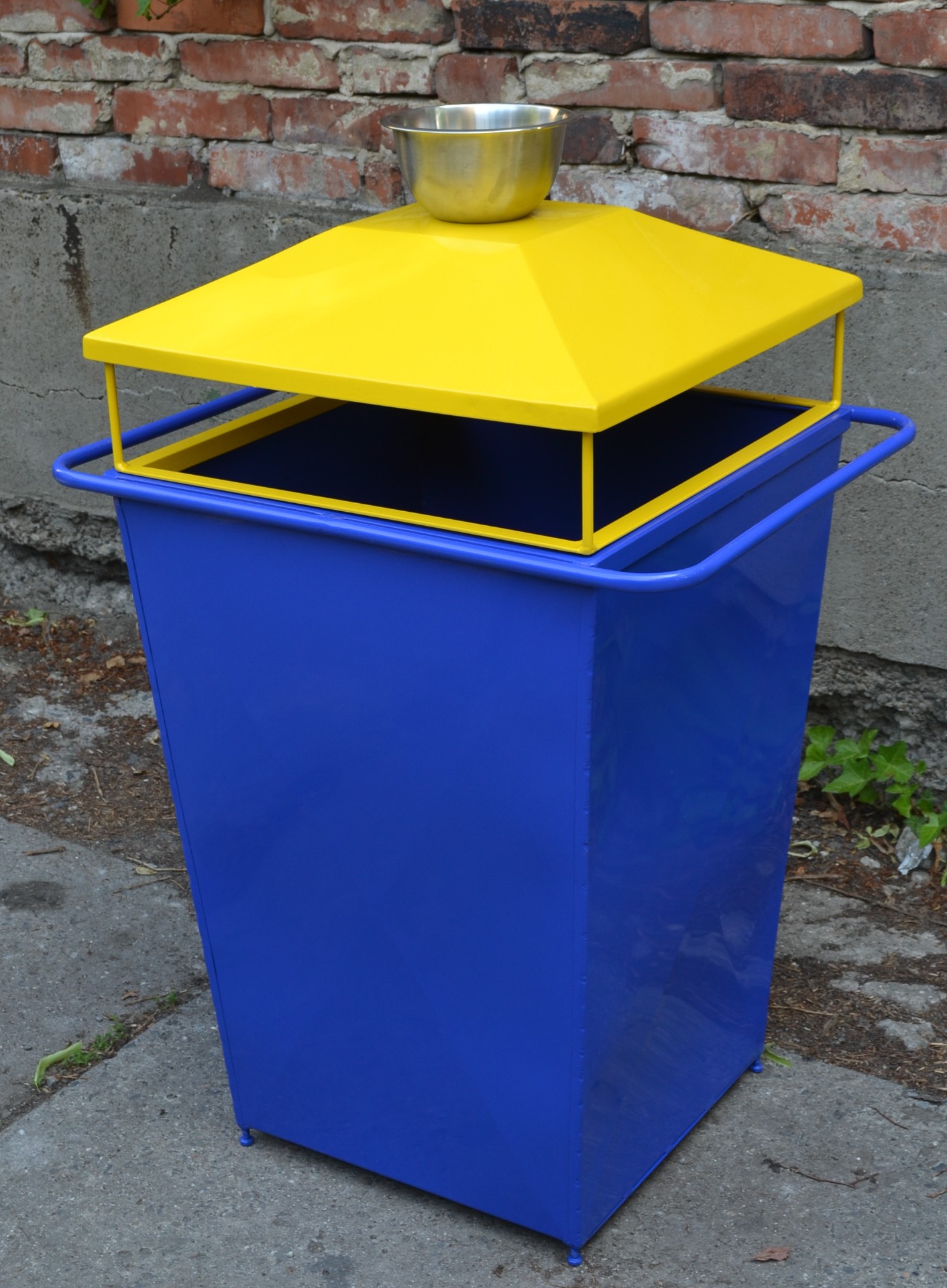 Venkovní kovový koš. Horní - žluté - víko je odnímatelné.