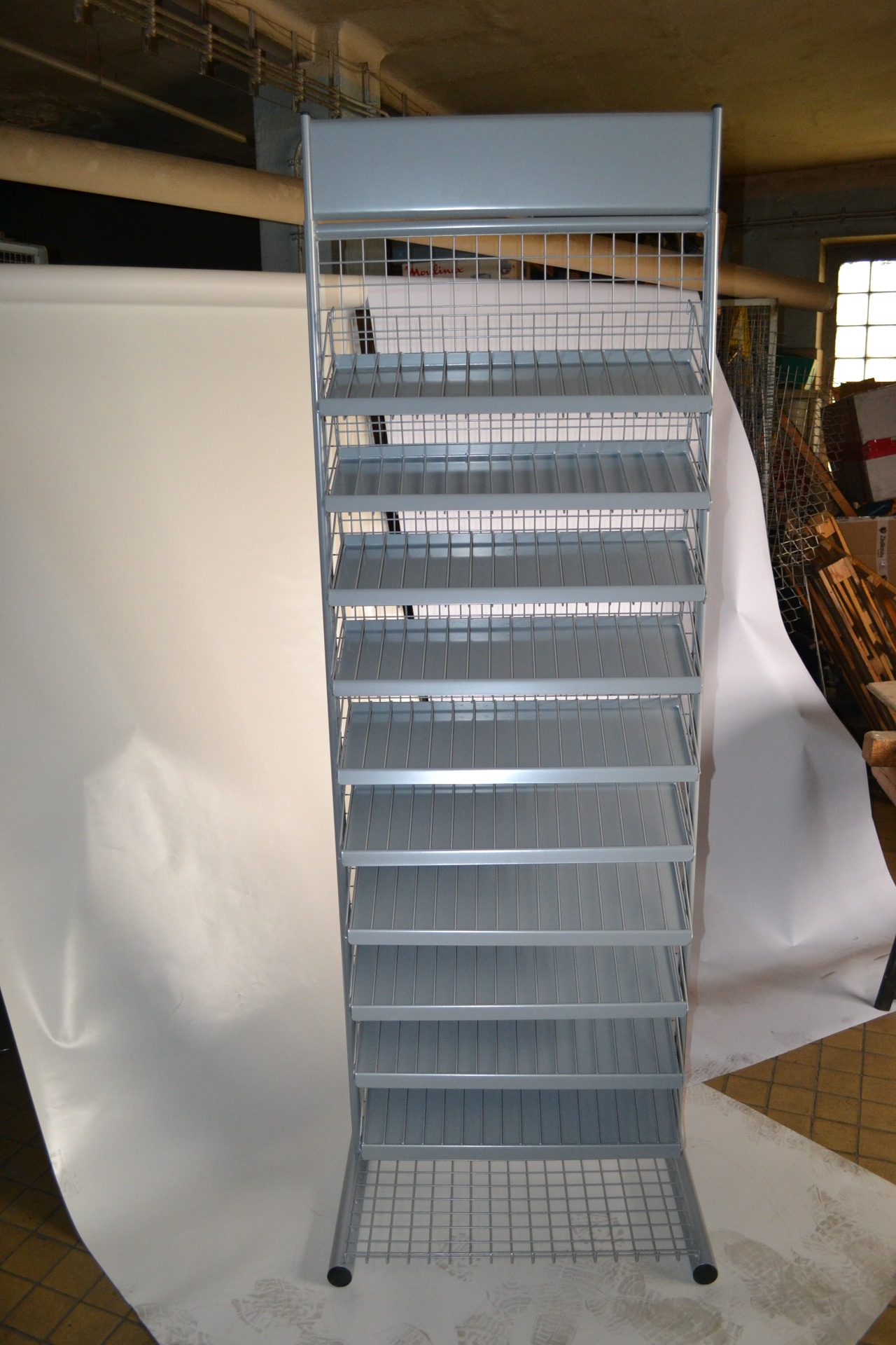 velký stojan do kterého se vejde 10 polic, v každé je 16 řad lahviček po 6ti kusech takže v tomto stojanu je možno vystavit až 960 lahviček. Počet polic jako i počet řad je možno na přání změnit.