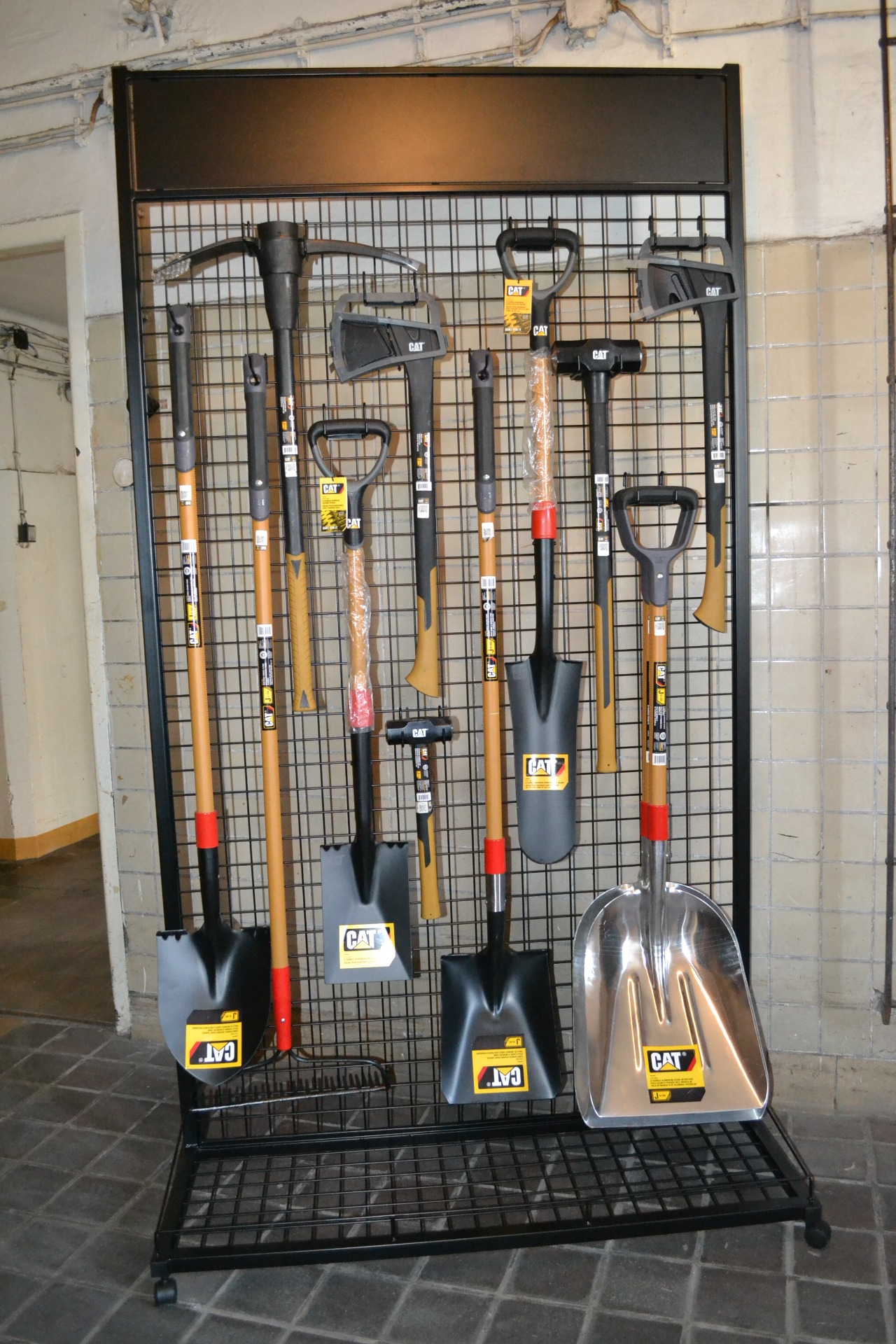 Velký a silný stojan - cca 220 x 120 cm, deska na reklamu lamino, sítě na zboží silnější, háčky atyp pro každý druh výrobku.