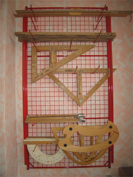 ukázka sestavy tří stojanů k umístění do rohu, střední stojan je na dvou krajních zavěšený a úhel lze měnit, počet košů a háčků i jejich velikost lze upřesnit v objednávce